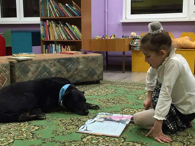 Или новая форма, «Читаем вместе с собакой», когда дети читают книги вслух... собаке. Это своего рода терапия, в частности для ребят, которые стесняются читать, заикаются, испытывают другие затруднения; а на этом занятии их точно не будут ругать, поправлять, это раскрепощает. Собаки, конечно, подготовленные, на мероприятии всегда дежурит кинолог-терапевт.