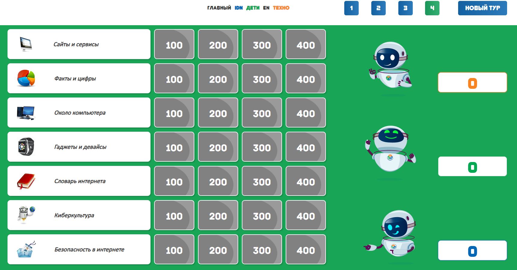 В новом туре традиционно 7 категорий: «Сайты и сервисы», «Факты и цифры», «Около компьютера», «Гаджеты и девайсы», «Словарь интернета», «Киберкультура» и «Безопасность в интернете». Каждый состоит из 4 вопросов разной сложности.