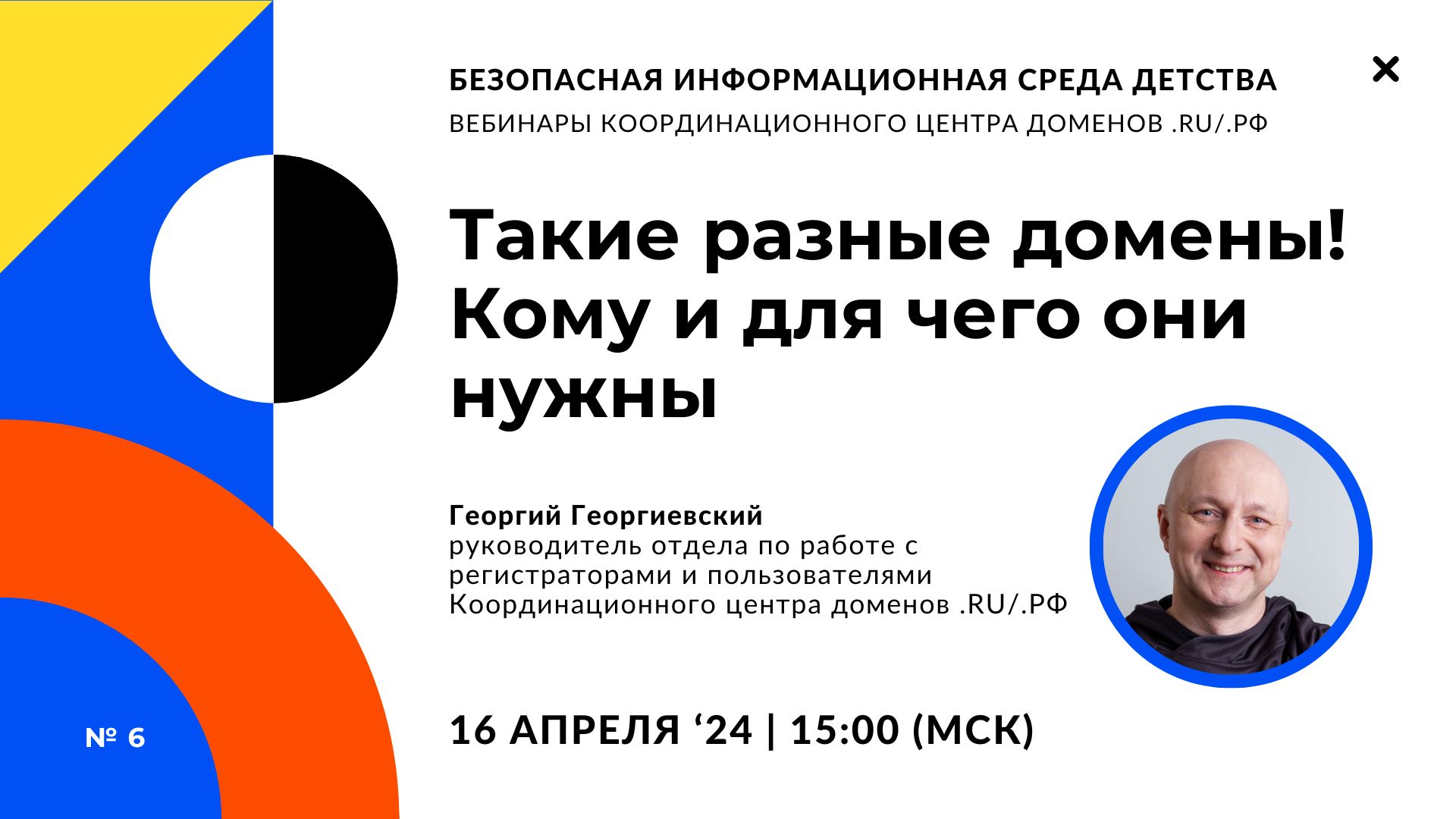 16 апреля в 15:00 (МСК) на VK-площадке проекта «Безопасная информационная среда детства» пройдет шестой вебинар Координационного центра .RU/.РФ «Такие разные домены! Кому и для чего они нужны», который в этот раз посвящен 30-летию национального домена .RU, стартовавшему 7 апреля. Слушателей ждёт один, насыщенный полезной информацией, доклад формата «ликбез».