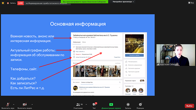 Анастасия Сабирова, спикер портала «PROКультураРФ», рассказала о необходимости использования социальных платформ библиотеками, ведь каждый новый подписчик может конвертироваться в читателя. Для этого необходимо продвижение сообществ: коммерческое, которое предполагает использование рекламы; бартер, то есть реализация совместных проектов с другими сообществами; или бесплатное – использование всевозможных «встроенных» инструментов, которые предлагают социальные сети. «Правильное оформление начинается с адреса группы – оно должно отражать суть сообщества, легко запоминаться. Важно использовать и разнообразные инструменты подачи контента: закрепление записей, оформление меню, создание подкастов, статей, видео и мероприятий, - отметила Анастасия Сабирова. – Так же важно работать над контентпланом, чтобы ведение сообщества было систематизированным и полноценным».