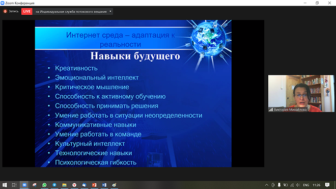 О характерных особенностях цифровой коммуникации рассказала Виктория Михайлова, психолог отдела психологической поддержки молодёжи Областной юношеской библиотеки им. А.А. Суркова. По мнению спикера, интернет-среда – это не только и не столько взаимосвязанные компьютеры и сети, но и взаимосвязанные и активно действующие в этой среде люди вместе с продуктами их активности: сообщениями, веб-страницами, записями. «Цифровая коммуникация предполагает наличие смешанной реальности, когда виртуальные технологии проникают в нашу повседневную жизнь, а также постепенное исчезновение анонимности в интернете – всё, что бы мы ни делали в сети, влияет на нашу репутацию», - отметила Виктория Михайлова.