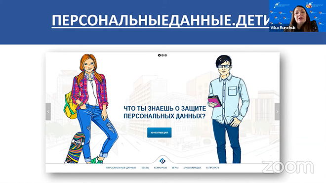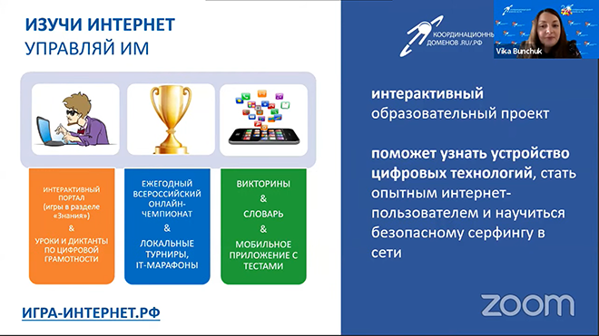 О проектах по интернет-безопасности, которые библиотеки и учреждения культуры могут использовать в своей работе с детьми, рассказала представитель домена .ДЕТИ Виктория Бунчук. Например, проект «Изучи интернет – управляй им». Он включает интерактивный портал с образовательными играми, викторину с тремя сотнями увлекательных вопросов об интернете и цифровых технологиях, приложение с тестами, словарь интернета; на платформе проекта регулярно проводятся онлайн-турниры и чемпионаты по киберграмотности.